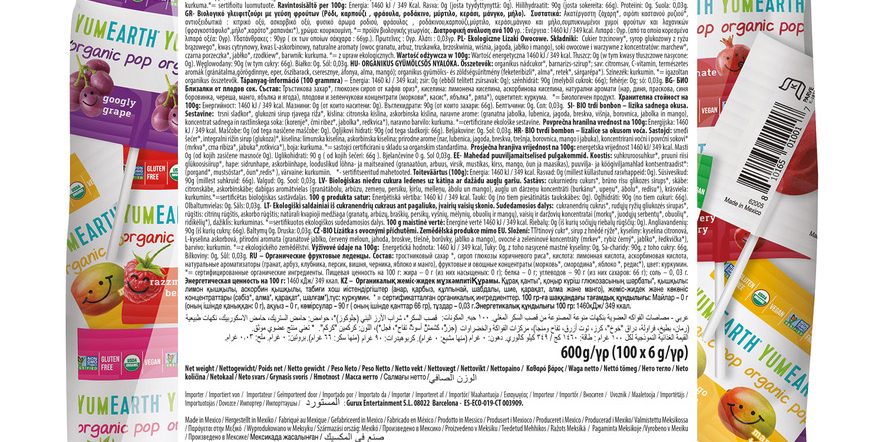 Состав: тростниковый сахар, рисовый сироп, лимонная кислота, аскорбиновая кислота, натуральные ароматизаторы (гранат, арбуз, клубника, персик, вишня, черника, яблоко и манго), концентрированные соки моркови, черной смородины, яблока* и редиса*, натуральный краситель: куркумин.